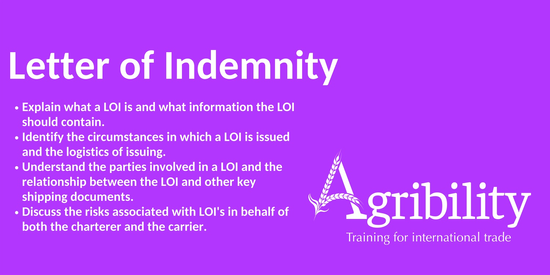 This module will provide an understanding of what a Letter of Indemnity (LOI) is, why it is needed and how it is used in the commodity industry. The format of a LOI will be explained, plus any risks associated with using LOI's will be discussed. We will consider best practice when using LOI's in the commodity trade.