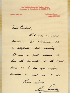 Thank you letter from lord mayor of london”-- Letter written by Sir Robin Gillet after attending a Luncheon at the Baltic Exchange